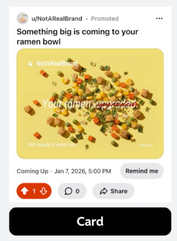 In Sachen Ads testet Reddit gerade etwas Neues. Reminder Ads. Die kannst du für Produktstarts und Events einsetzen. Die Anzeigen bekommen eine „Remind Me“-CTA, über den Nutzer:innen sich für eine Push-Benachrichtigung und eine zusätzliche Erinnerung im Posteingang am Tag der Veranstaltung anmelden können.